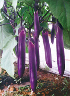 This F1 Hybrid is easy to grow. The plants are vigorous, early and prolific. Fruit is long and slender in shape, length about 30-40cm, purple-red skin and white flesh, good quality.